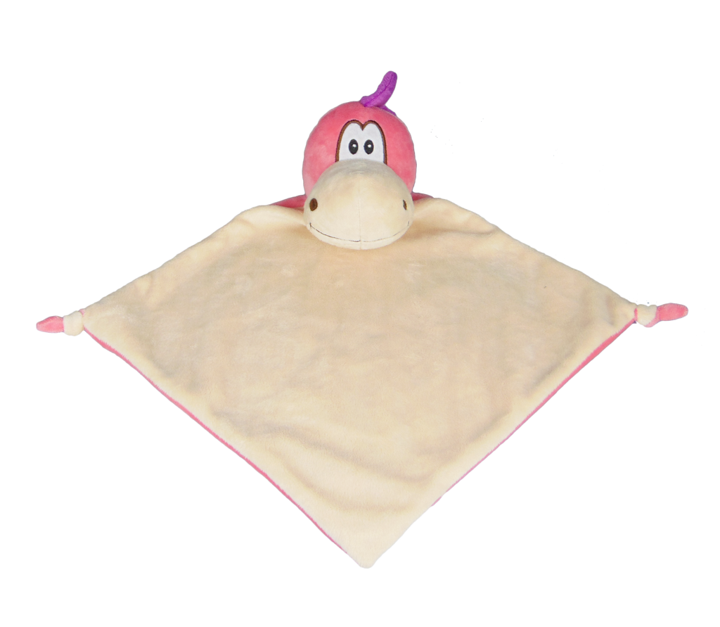 11"x11" pink dragon snuggle buddy comforter.